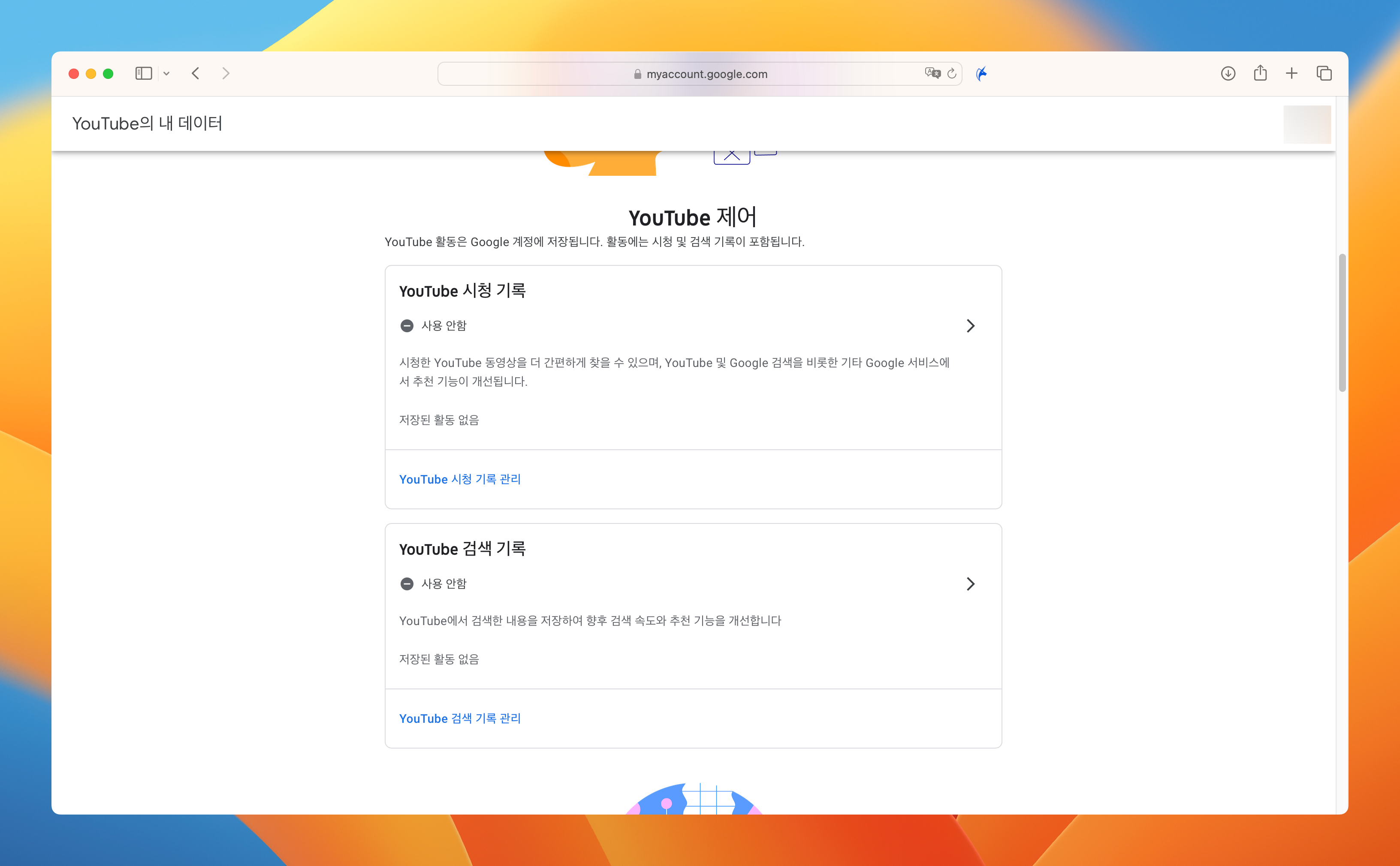 체크를 모두 해제한 후 다시 'YouTube 제어' 페이지를 확인해 보면, 시청 및 검색 이력 기록을 사용하지 않는 것으로 잘 바뀌어 있다.