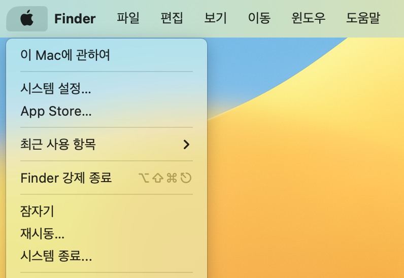 맥의 사과 마크를 눌러 메뉴를 열게 되면, 가장 상단에는 '이 Mac에 관하여'라는 메뉴가 위치하고 있다.